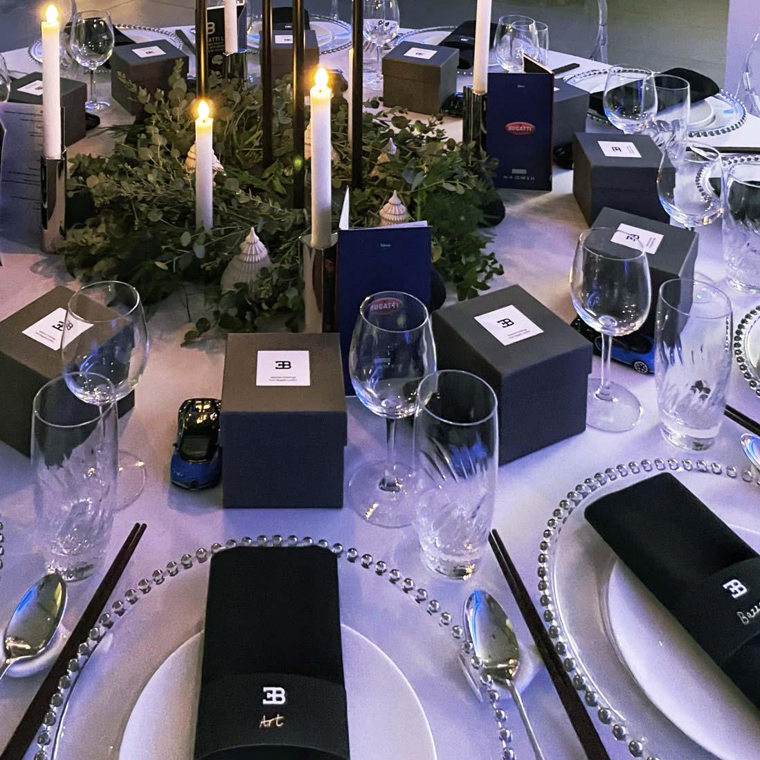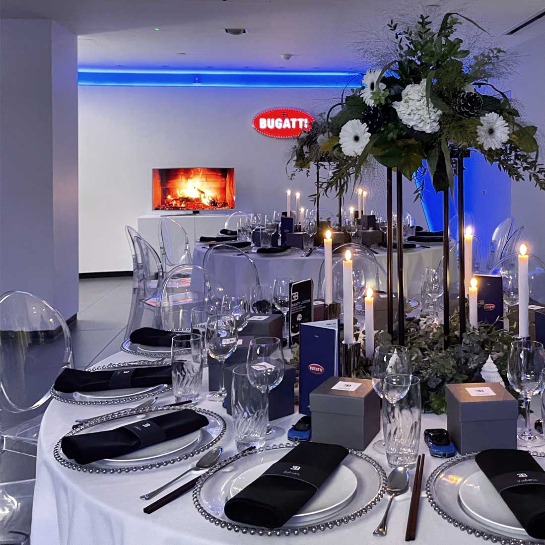 For Bugatti’s exclusive Christmas party, which was hosted at their luxurious showroom in Mayfair London, we transformed the space into a stunning intimate dinner venue.