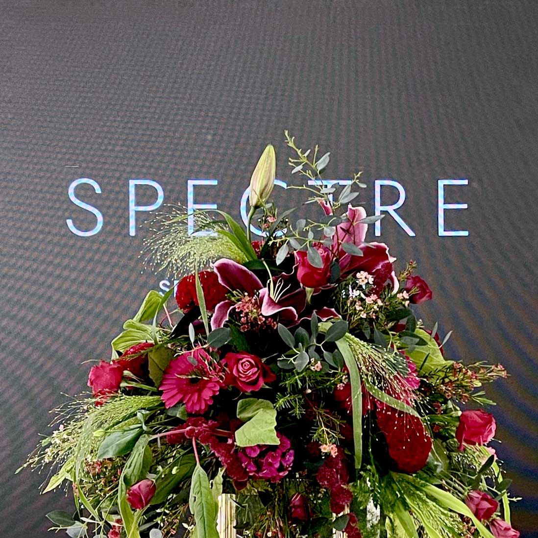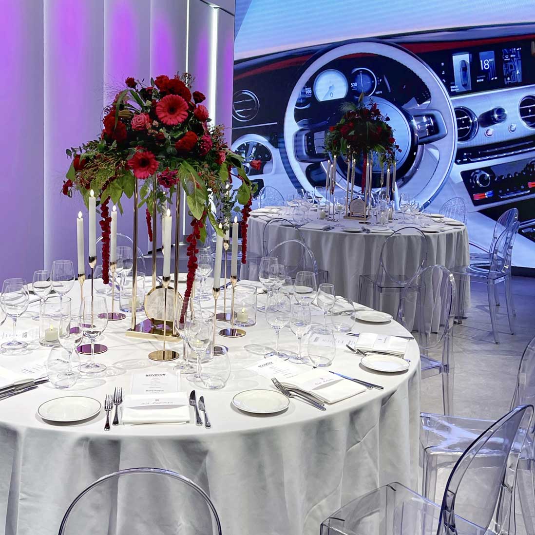 We designed bespoke ornaments inspired by the Spectre’s stunning dashboard, created floral displays and sourced tablescape elements matching the car’s luxurious details.